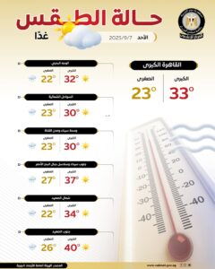 الرئيسية/طقس/تعرف على درجات الحرارة.. الأحد طقس تعرف على درجات الحرارة.. الأحد 7 سبتمبر، 2025 12 فيسبوك X لينكدإن واتساب تيلقرام مشاركة عبر البريد يقدمها : عبدالرحمن مصطفى 7 سبتمبر، 2025 12 فيسبوك X لينكدإن واتساب تيلقرام مشاركة عبر البريد فيسبوك X واتساب تيلقرام مشاركة عبر البريد طباعة