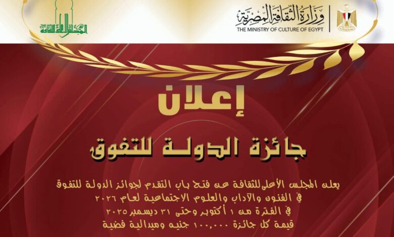 المجلس الأعلى للثقافة يعلن فتح باب التقدم لجوائز الدولة للتفوق في الفنون والآداب والعلوم الإجتماعية لعام 2026
