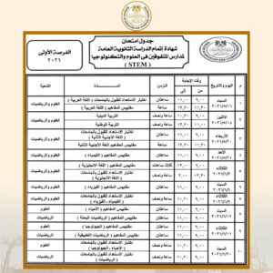 كما تبدأ امتحانات شهادة إتمام الثانوية العامة بمدارس المتفوقين في العلوم والتكنولوجيا “STEM” (الفرصة الأولى) يوم 16 مايو 2026 وتنتهي يوم 20 يونيو 2026، وتبدأ امتحانات (الفرصة الثانية) يوم السبت 4 يوليو 2026 وتنتهي يوم 22 يوليو 2026.