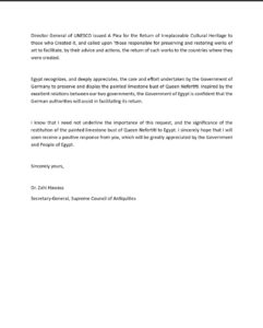 يُعد هذا الخطاب هو “الوثيقة الأم” في ملف الاسترداد، حيث نقل الملف من مجرد تصريحات إعلامية إلى طلب استرداد رسمي يستند إلى المواثيق الدولية واتفاقية اليونسكو لعام 1970.