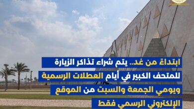 إبتداءا من غد .. تنظيم جديد لحجز تذاكر المتحف المصري الكبير بسبب الإقبال القياسي للزائرين والذى يتخطى السعه القصوى للمتحف