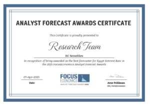 فاز فريق البحوث المالية في اتش سى لتداول الأوراق المالية والسندات، بجائزة ” أفضل توقعات للقطاع النقدي المصري ضمن جوائز مؤسسة فوكس إيكونوميكس 2025″ FocusEconomics، حيث حقق الفريق المركز الأول في توقعات سعر الفائدة والمركز الثالث في توقعات مستوى التضخم في مصر.