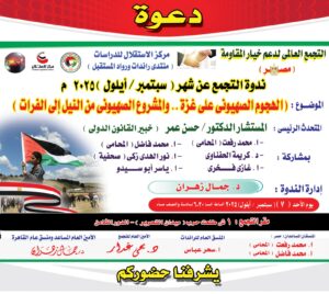 يعقد التجمع العالمي لدعم خيار المقاومه بمشاركه مركز الاستقلال للدراسات ومنتدى رائدات ورواد المستقبل ندوته الشهريه الاحد القادم 7 سبتمبر بمقره بميدان التحرير