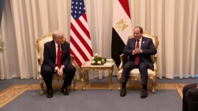 قبل أن اختم كلمتي، وتقديراً لجهود الرئيس دونالد ترامب، فإنني أود أن أعلن أمام الحضور الكريم قرار مصر إهداء فخامته “قلادة النيل”، وهي الأرفع والأعظم شأناً وقدراً بين الأوسمة المصرية، وتمنح لرؤساء الدول ولمن يقدمون خدمات جليلة للإنسانية…