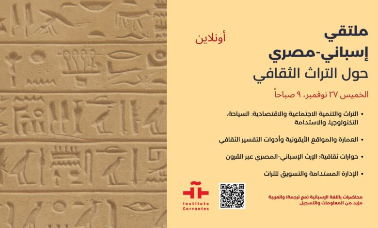 ينطلق غداً الخميس 27 نوفمبر 2025، بمقر معهد ثربانتس بالقاهرة، الملتقى العلمي المصري–الإسباني تحت عنوان “التراث الثقافي بين الابتكار والإدارة المستدامة”، بإشراف الدكتور إبراهيم العسال، المستشار الفخري لسفارة فنزويلا بالقاهرة وعضو لجنة التراث الثقافي بالاتحاد الأندلسي في إسبانيا، وبمشاركة نخبة من الخبراء والمتخصصين من البلدين.
